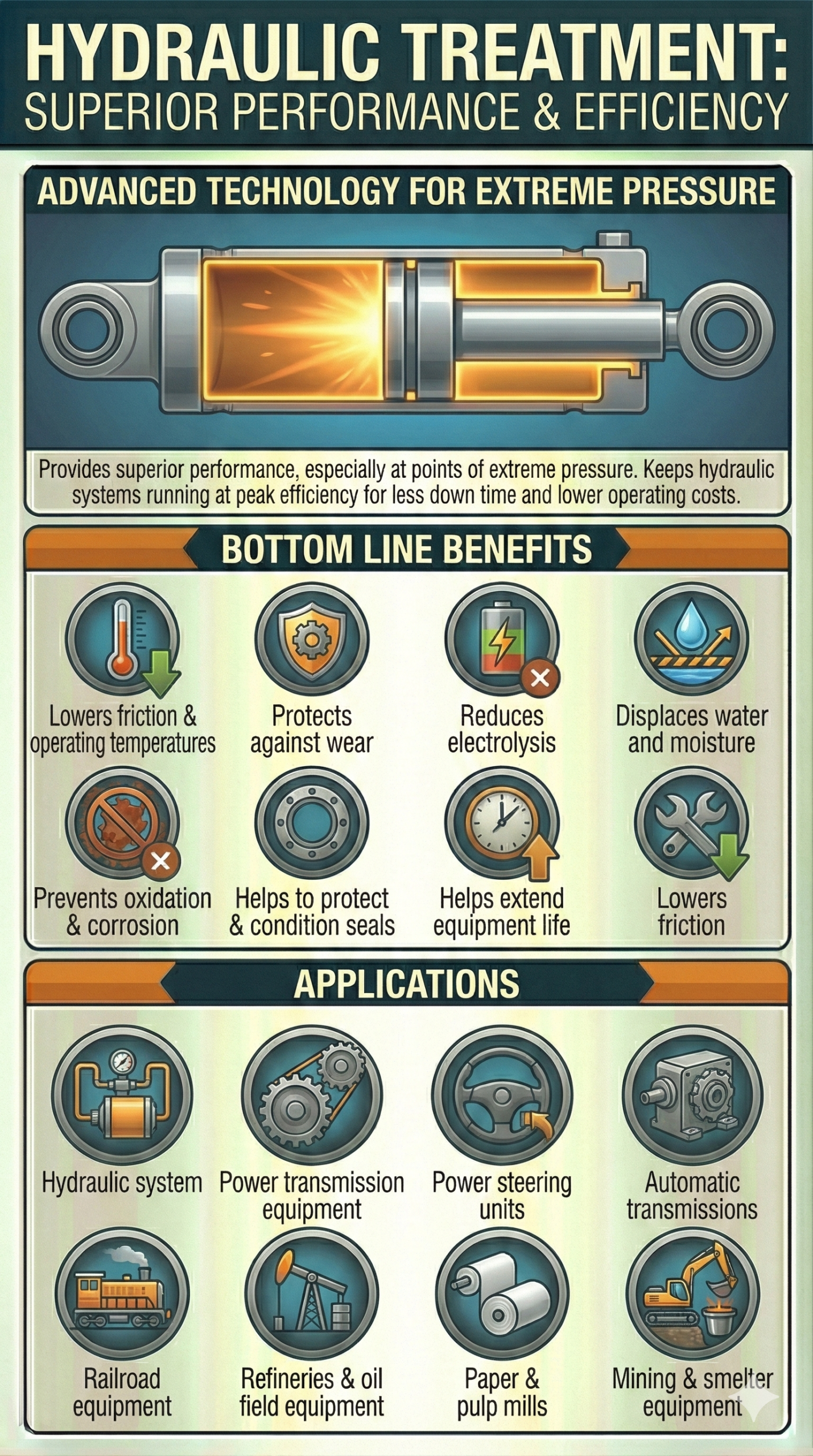 With advanced technology, our Hydraulic Treatment provides superior performance, especially at points of extreme pressure, to help keep hydraulic systems running at peak efficiency, which means less down time and lower operating costs.
