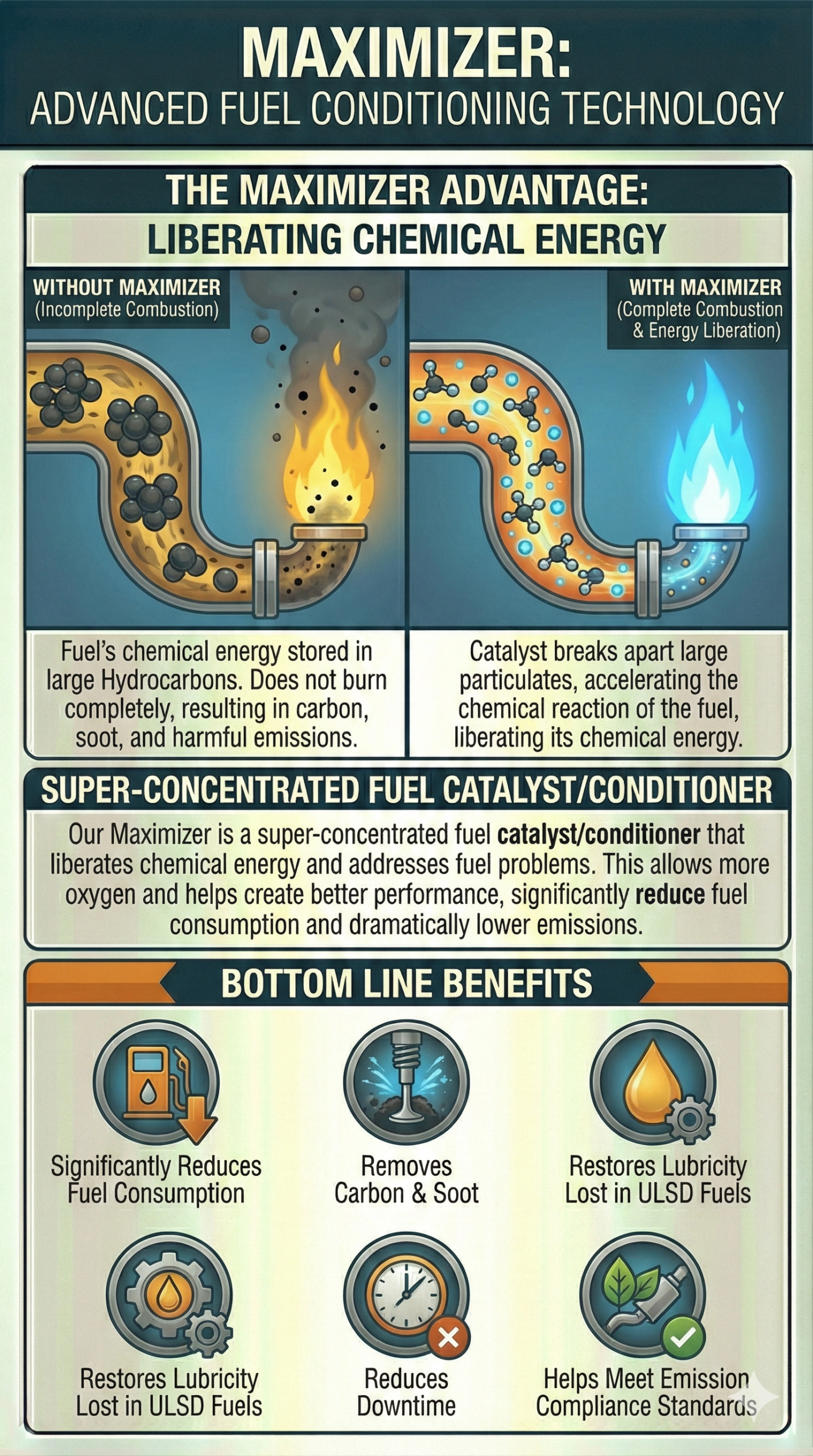 Our Maximizer is a super-concentrated fuel catalyst/conditioner that liberates chemical energy and addresses fuel problems. This allows more oxygen and helps create better performance, significantly reduce fuel consumption and dramatically lower emissions.