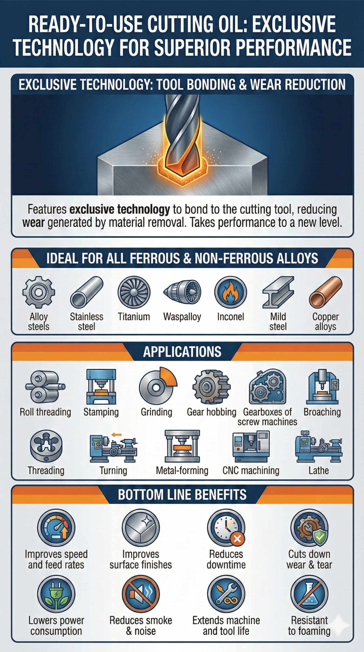 Using our exclusive technology, this ready-to-use cutting oil takes performance to a new level by bonding to the cutting tool which reduce wear generated by material removal.
