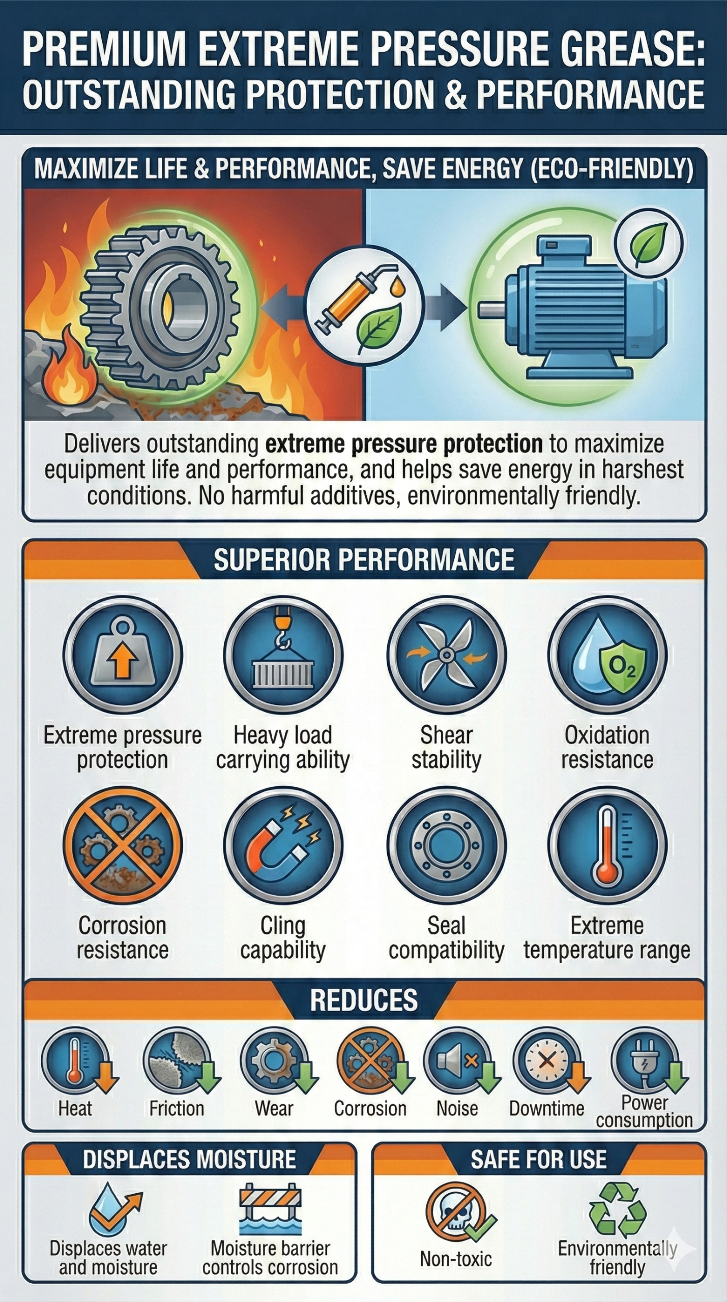 Delivers outstanding extreme pressure protection to help maximize equipment life and performance, and helps save energy, even under the harshest conditions. And with no harmful additives, this premium grease is environmentally friendly.SUPERIOR PERFORMANCE: