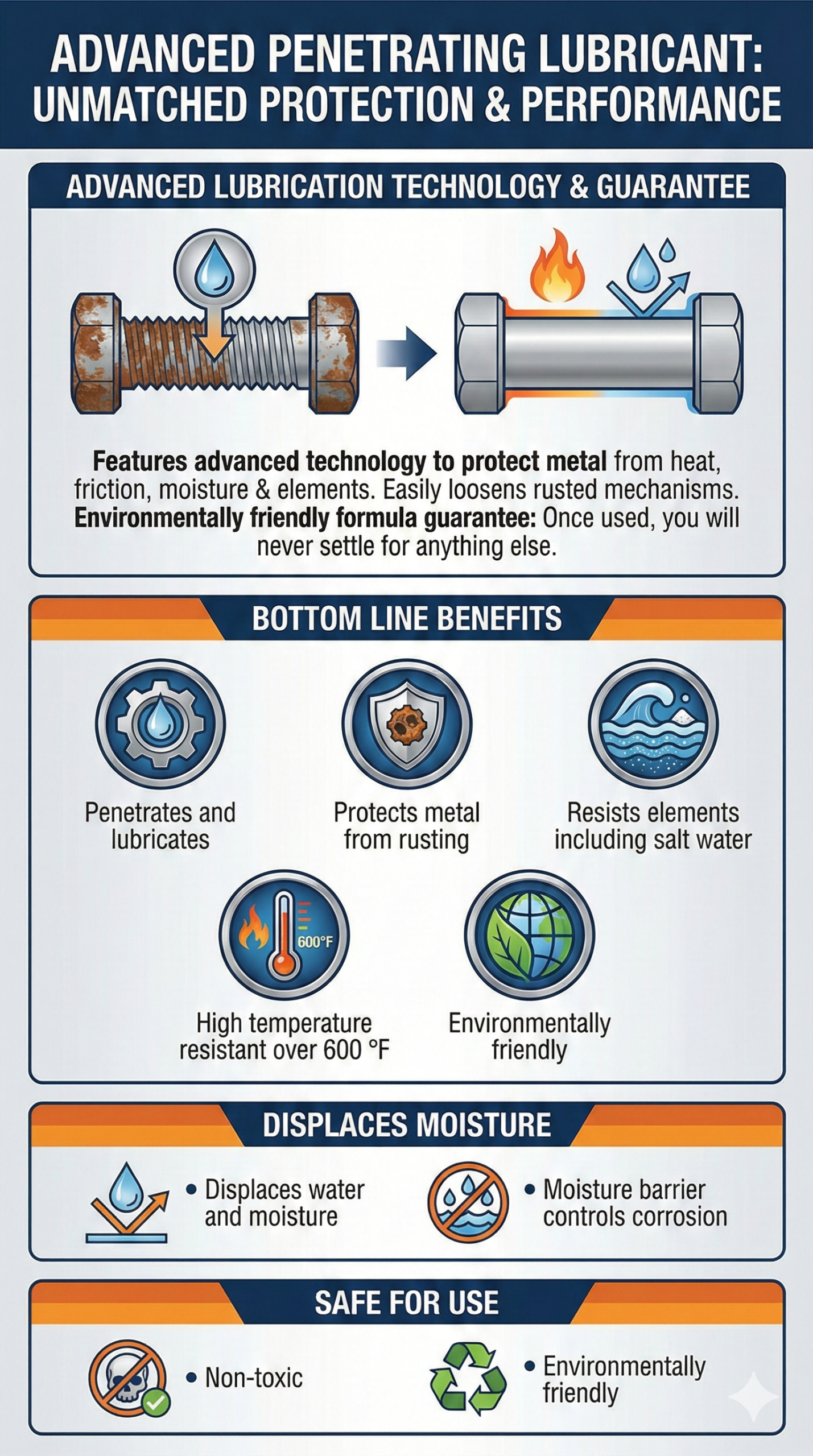 No other penetrating lubricant offers our advanced lubrication technology which protects metal surfaces from heat, friction, moisture and the elements and easily loosens rusted or sticky mechanisms. We guarantee that once you use this environmentally friendly formula you will never settle for anything else again.